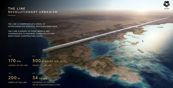 The general explanation is as follows: NEOM is a projected futuristic city in Saudi Arabia's Tabuk Province near the Red Sea. The Crown Prince of Saudi Arabia: Mohammed bin Salman intends to develop this new city in the desert as a future utopia that incorporates the greatest features of modern city living convenience, sustainability, and community, while leaving the bad (traffic, pollution, trash, and insecure water sources) behind. This metropolis will be shaped like a long, thin line. All utilities and care required by people will be easily available within the city. The outdoors will also be conveniently accessible. NEOM's big aim is to establish an urban oasis where mankind and environment can coexist peacefully, rather than an ever-expanding suburban city that encroaches on the natural world surrounding it.